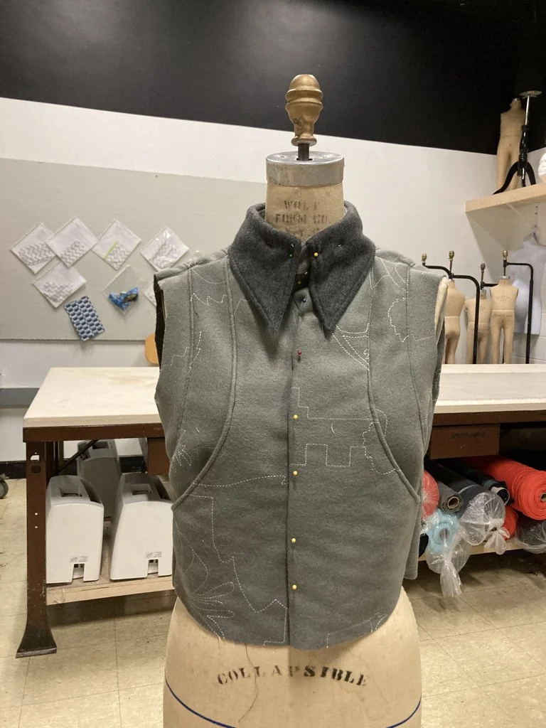 The heavier fabric showed the shape and structure of the jacket much better. Pockets were inset into the curves and a collar was attempted. It came out very large and was re-sized for the final. The length was shortened to be more cropped.